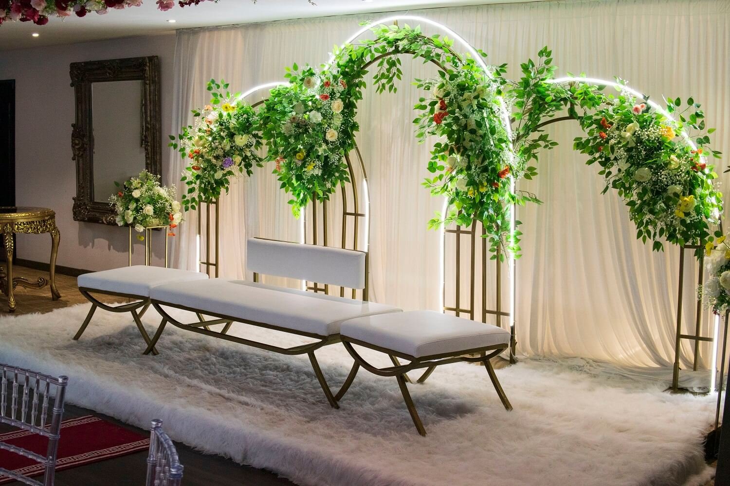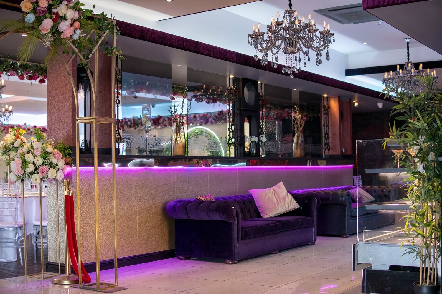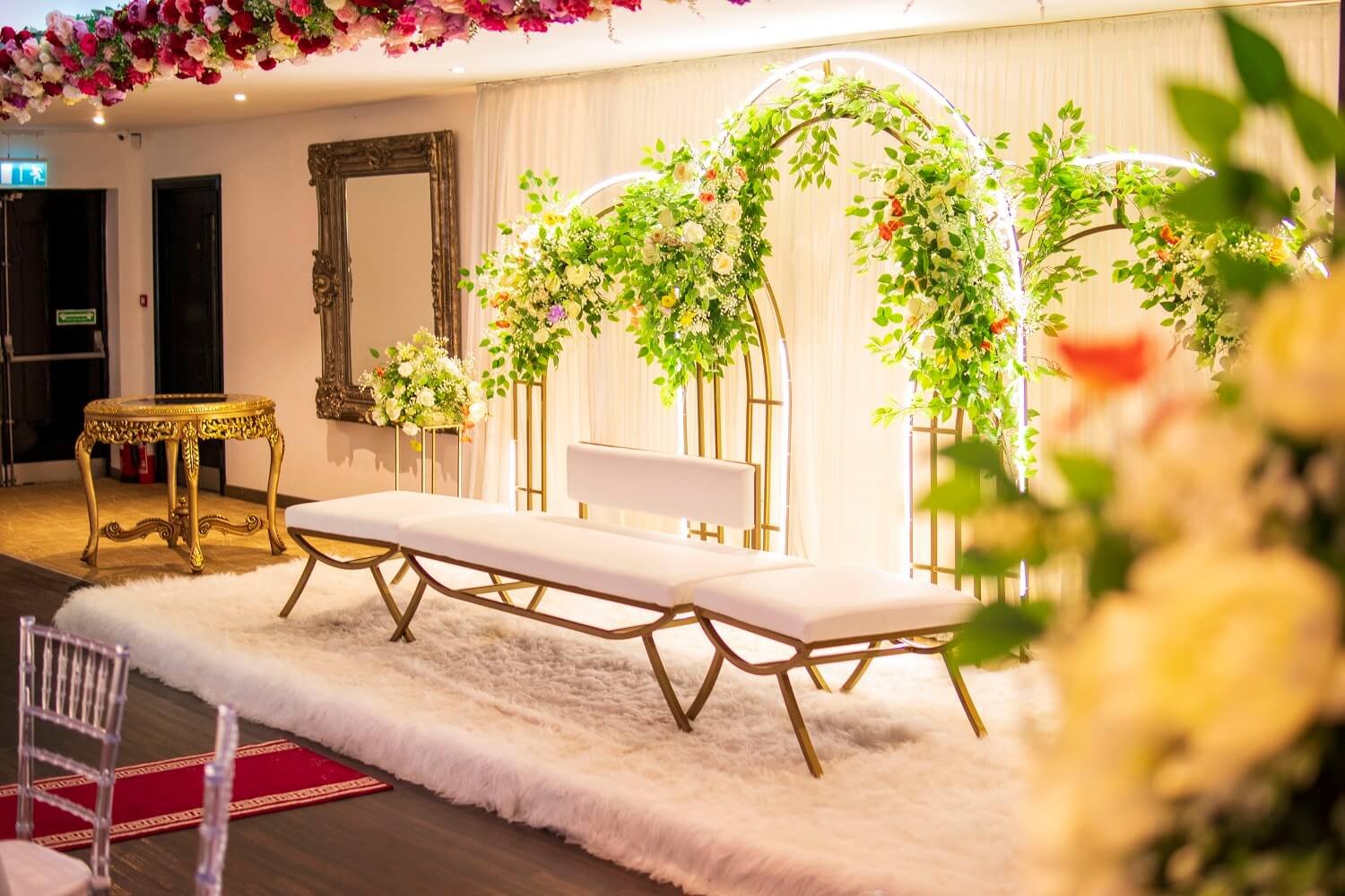 Wedding hall at The Maison Bradford with floral arches, clear chairs and elegant table settings, showing how the venue transforms for celebrations.