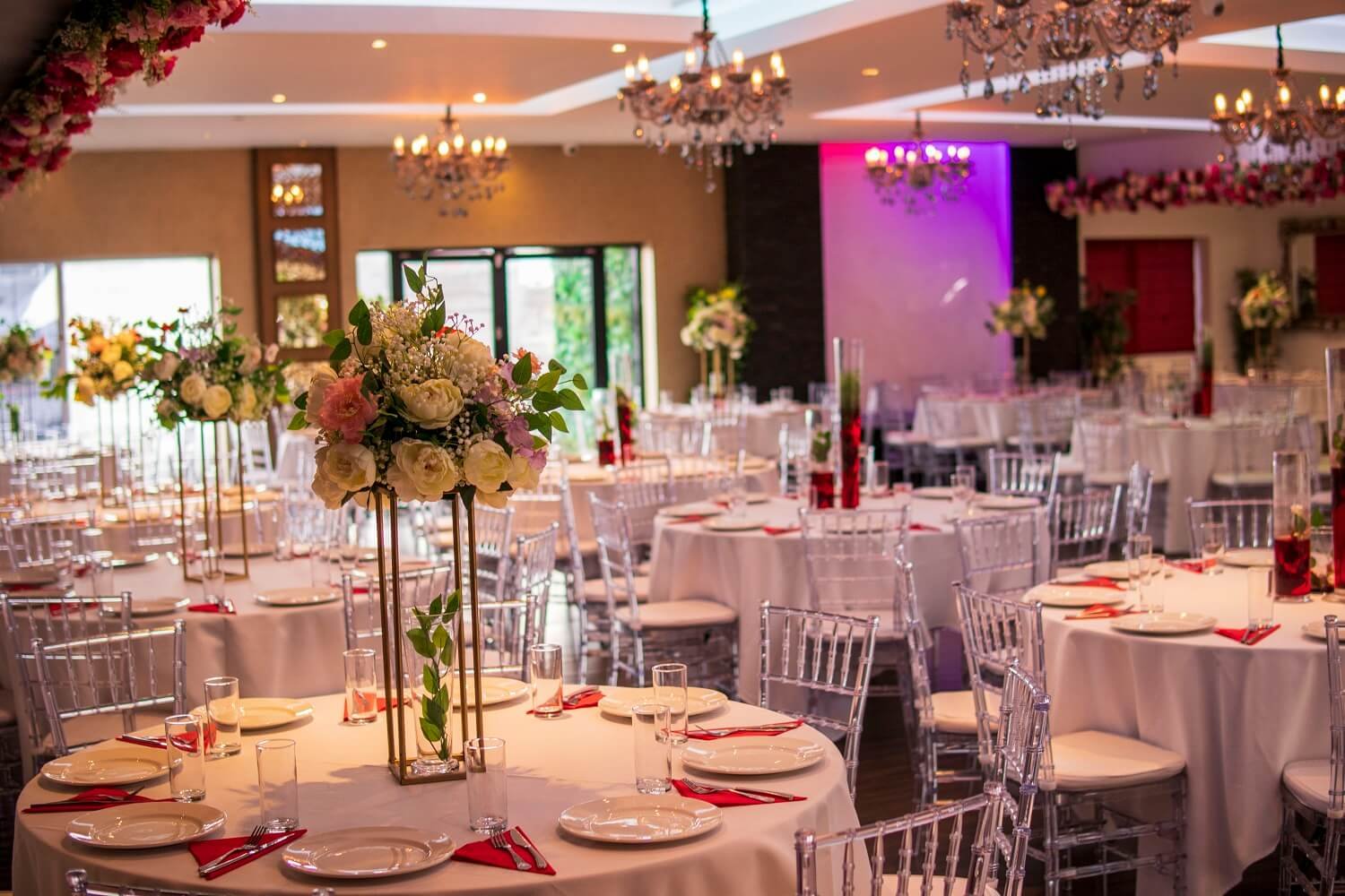 Wedding hall at The Maison Bradford with floral ceiling garlands, clear chairs, and round tables set for Asian weddings and Nikah ceremonies.